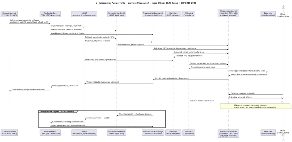 Kronosysteemi määrittää 2026–2030 kauden omavaraisuuden ja strategiset alat Puoluekeskukselle, joka antaa MOSTille S&T-linjauksen, jakaa ministeriöille alakohtaiset tiekartat ja osoittaa provinsseille ja kaupungeille hubiroolit. MOST luo puitteet ja standardit, ministeriöt avaavat missiokilpailut ja paikallistaso tarjoaa meso-ekosysteemille strategiat, kannusteet ja infrastruktuurin. Rahoituskanavat rahoittavat mesoa, joka raportoi TRL-tulokset; MOST valvoo allokaatioita. Etiikka ohjeistaa, meso tuottaa ennakkorekisteröinnit. Meso siirtää dual-use-teknologiaa, dual-use muuttaa standardeja ja IPR-ehtoja. Meso palauttaa kyvykkyys- ja pullonkaulatiedot paikallistasolle, paikallistaso kokoaa ja toimittaa MOSTille, MOST raportoi Puoluekeskukselle, ja Puoluekeskus päivittää kronotavoitteet. Mikro (tutkija/tiimi) tuottaa tutkimusta, patentteja ja spin-offeja, saa rahoitusta ja ohjausta, mutta kohtaa ohjauksen tuomat vapausjännitteet. Rekursiivisesti paikallistaso ehdottaa skaalauksia ministeriöille, ministeriöt säätävät ja MOST koordinoi, ja Puoluekeskus tasapainottaa portfolion takaisin alueille.