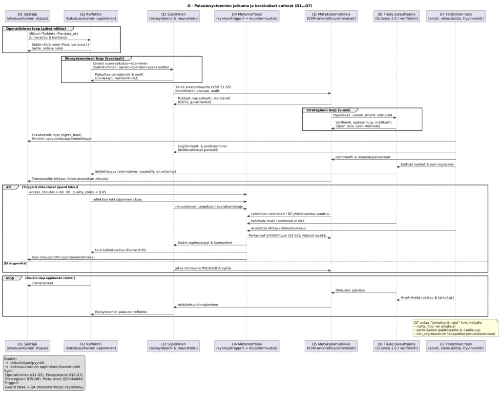- Syklejä on neljä: operatiivinen (Ω1–Ω2), ekosysteemi (Ω2–Ω3), strateginen (Ω5–Ω6), meta-arvot (Ω7↔kaikki).