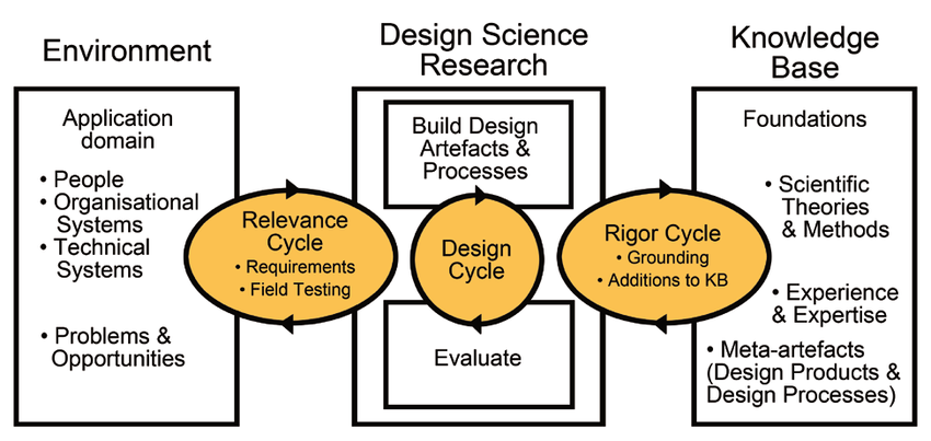 - Rigor Cycle (tietopohja ↔ tutkimus): mitä tiedetään jo (teoriat, mallit, standardit), mitä uutta lisätään?