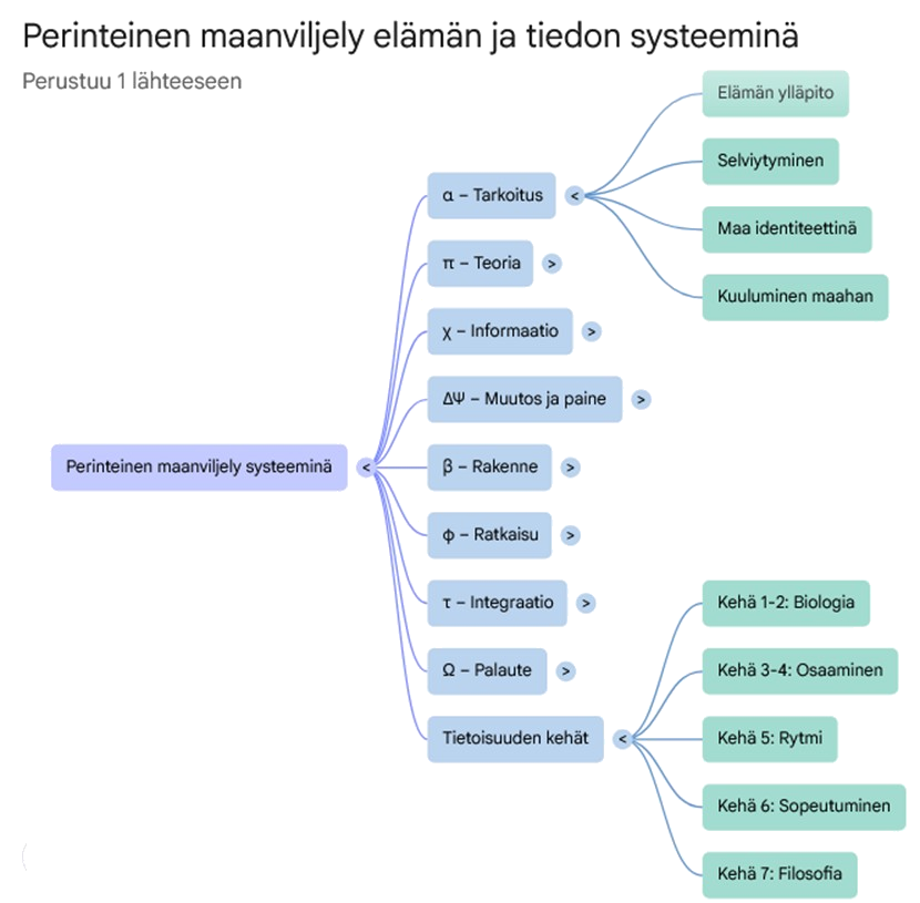Lähdemateriaali tarkastelee perinteistä maanviljelyä esimerkillisenä ja eheänä systeemiajattelun mallina, jota analysoidaan erityisesti systeemiteoreetikko Niklas Luhmannin ja GoodReason-viitekehyksen kautta. Tekstissä kuvataan, kuinka alkukantainen viljely yhdistää ihmisen toiminnan, luonnon havainnoinnin ja selviytymisen tarkoituksen saumattomaksi kokonaisuudeksi ilman modernin yhteiskunnan tuomaa pirstaloitumista. Kirjoittaja hyödyntää kreikkalaisia aakkosia symboloimaan eri osa-alueita, kuten hiljaista tietoa, ympäristön signaaleja ja yhteisöllistä rakennetta, osoittaen niiden välisen tasapainon. Maanviljely näyttäytyy prosessina, jossa tieto ja käytäntö ovat erottamattomia, ja jossa palautejärjestelmä rakentuu suoraan luonnon kiertokulun ja sadon onnistumisen varaan. Tämä analyysi nostaa esiin maatalouden merkityksen syvällisenä systeemisenä nollatasona, joka tarjoaa vertailukohdan nykyajan monimutkaisille rakenteille. Lopulta lähde esittää, että tällainen kokonaisvaltainen ymmärrys toimii pohjana tietoisuuden kehitykselle ja strategiselle ajattelulle epävarmassa maailmassa.