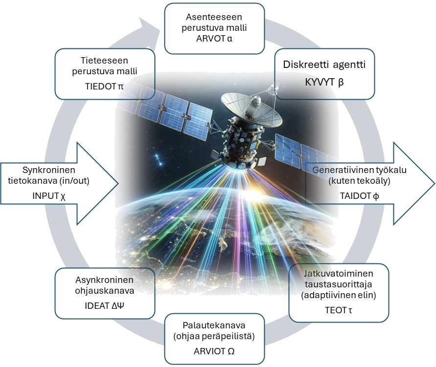 Eki: Mietin eräänlaisen kevennyksen helpoksi johdannoksi tähän kehäjärjestelmään. Powerpointin kaaviona se on kehä, jossa on kahdeksan ”agenttia”, joilla on helpot nimet oppia: – Asenteeseen perustuva agenttimalli ARVOT α – Diskreetti agentti KYVYT β – Generatiivinen työkalu (kuten esim. tekoäly) TAIDOT φ – Jatkuvatoiminen taustasuorittaja (adaptiivinen elin) TEOT τ – Palautekanava (ohjaa peräpeilistä) ARVIOT Ω – Asynkroninen ohjauskanava IDEAT ΔΨ – Synkroninen tietokanava (in/out) INPUT χ – Tieteeseen perustuva malli TIEDOT ϖ Tuosta luettelosta näkyy osa agentin roolistakin, koska ne ovat melko lailla erilaisia toiminnaltaan. Ohessa kuva siitä. Mitä mieltä olet tästä linjauksesta, jota voisi käyttää opetuksessa?